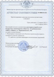 Аттестат соответствия: Инженерные изыскания для объектов строительства первого-четвертого классов сложности: Работы в составе инженерно-геологических изысканий.